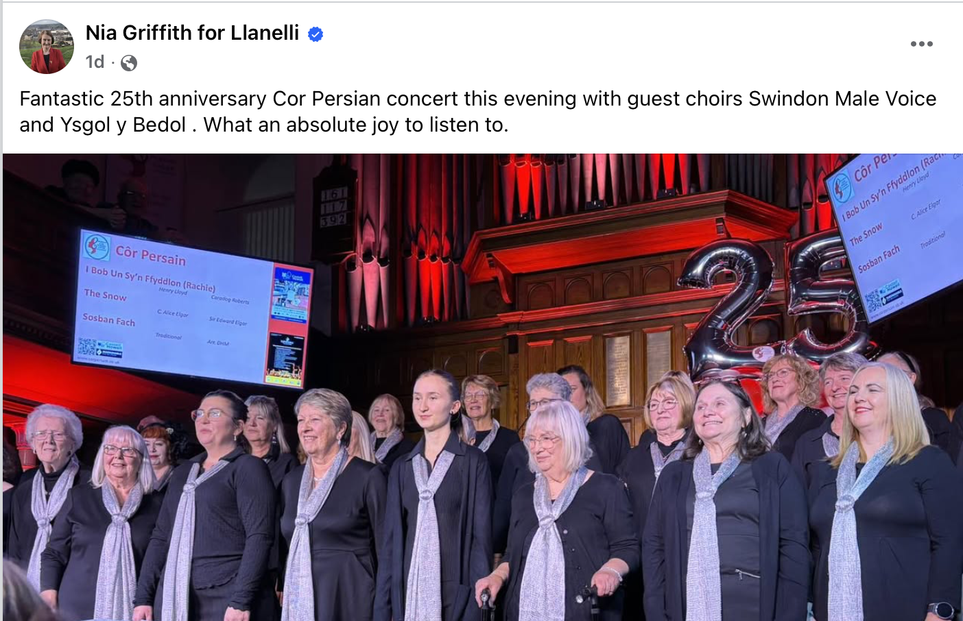 "My goodness, Côr Persain make a wonderful sound!" "O Dduw mawr, mae Côr Persain yn gwneud sain hyfryd!" “Harmoniau hyfryd, cryfder lleisiol a chydbwysedd gwych.” “Lovely harmonies, great vocal strength and balance.” “Your Musical Director Huw provided fun and humour to our audience, and of course masterful conducting of fantastic repertoire.” “Darparodd eich Cyfarwyddwr Cerdd Huw hwyl a hiwmor i’n cynulleidfa, ac wrth gwrs arwain repertoire gwych yn feistrolgar.” “Roedden ni i gyd mor falch eich bod chi wedi gallu dod atom ni a rhannu cerddoriaeth, cyfeillgarwch newydd ac wrth gwrs codi arian!” “We were all so pleased you could come to us and share music, new friendships and of course fundraise!”